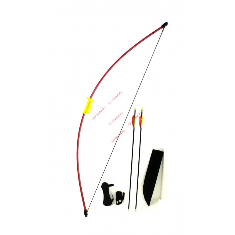 В комплекте: Лук, защита для руки, напальчник, две стрелы, колчан для стрел, мишень.